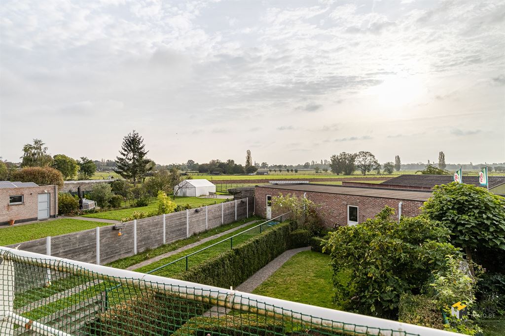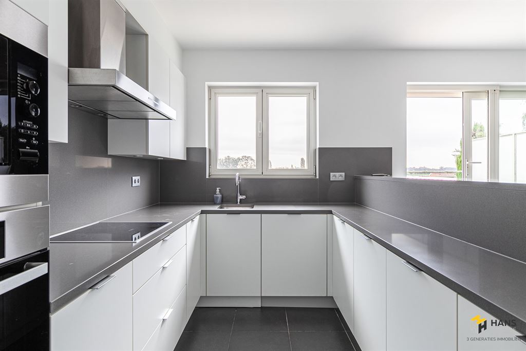 Je komt binnen in de centrale hal met vestiairekast. Aan de voorzijde situeren zich de 2 volwaardige slaapkamers van 10 m² en 13 m², beide voorzien van een ingemaakte kastenwand. De hal geeft verder ook uit op de badkamer (5 m²) met douche, dubbele lavabo en handdoekdroger. De wc is apart. Achteraan situeert zich de lichtrijke woonkamer met open keuken, goed voor een oppervlakte van zo’n 40 m². Het gunstige zicht op de achterliggende velden springt hier meteen in het oog. De keuken is uitgerust met alle hedendaags comfort (kookvuur, dampkap, spoelbak, ingebouwde oven, microgolfoven, vaatwasser, frigo en diepvries) en grenzend hieraan is er een wasplaats/berging (2 m²). De troef van dit appartement is ongetwijfeld het ruime terras (26 m²) met zuid-oost-oriëntatie.