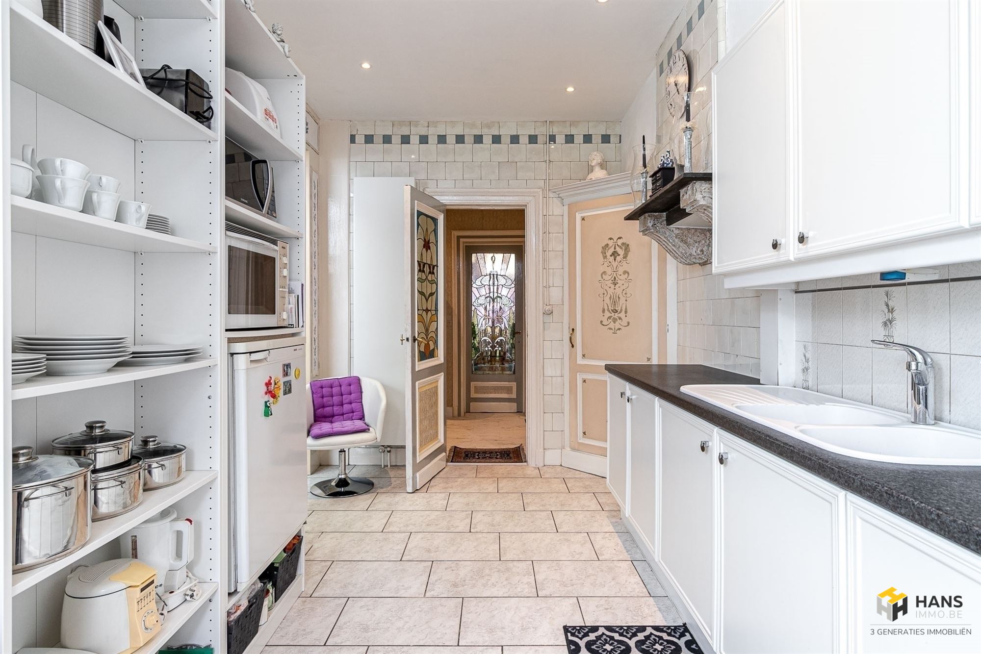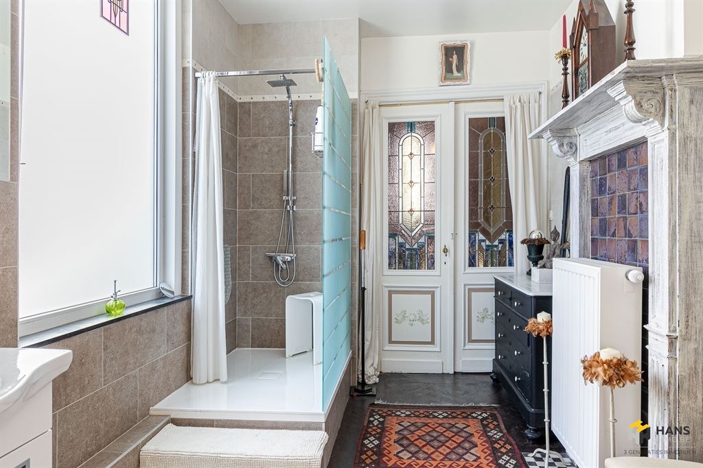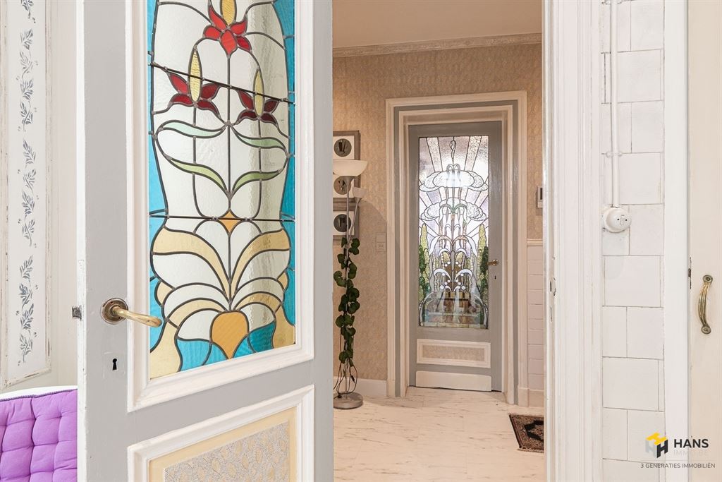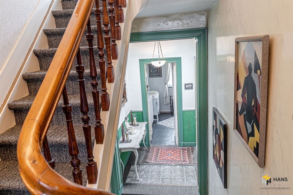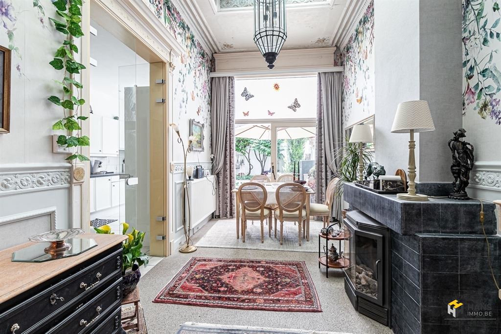 Je komt binnen in de inkom-/traphal, waar de ruimtelijkheid en de authentiek bewaarde elementen meteen in het oog springen. Rechts heb je toegang tot de woonkamer (35 m²), die achteraan overloopt in de lichtrijke eetkamer (17 m²). De keuken (15 m²) is apart. Nog een extra troef van dit unieke pand is ongetwijfeld de gezellige stadstuin (51 m²) met zuid-west-oriëntatie.
