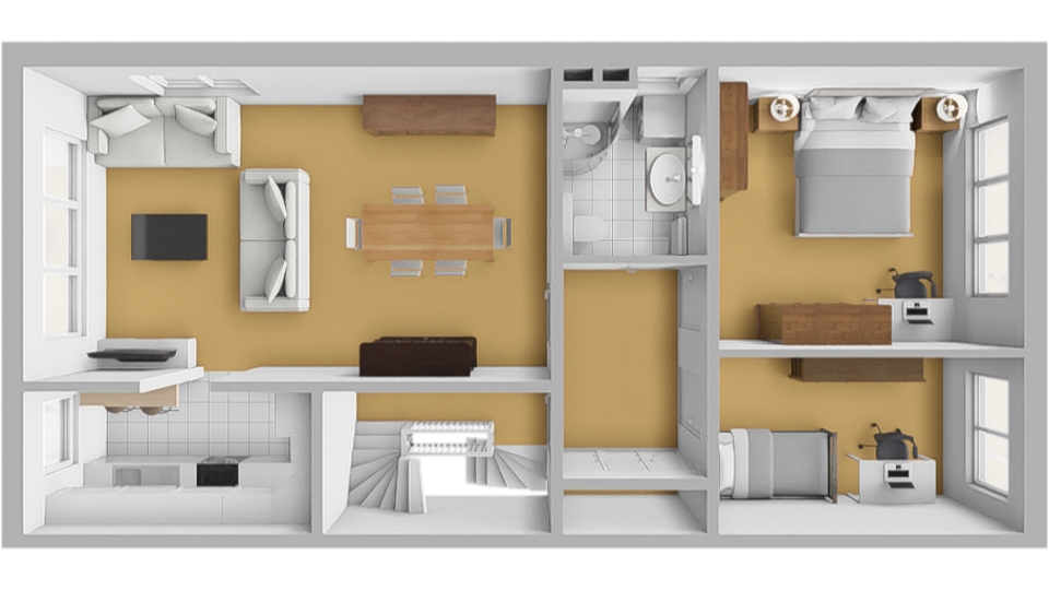 Je komt binnen in de hal met ingemaakte vestiairekast. Aan de voorzijde heb je toegang tot de lichtrijke woonkamer (26 m²) met aangrenzend de aparte keuken (7 m²), die uitgerust is met alle hedendaags comfort. Centraal in het appartement bevindt zich de badkamer (4 m²) met douchecabine, lavabo en wc. De 2 slaapkamers bevinden zich aan de achterzijde en zijn 9 m² en 13 m² groot.