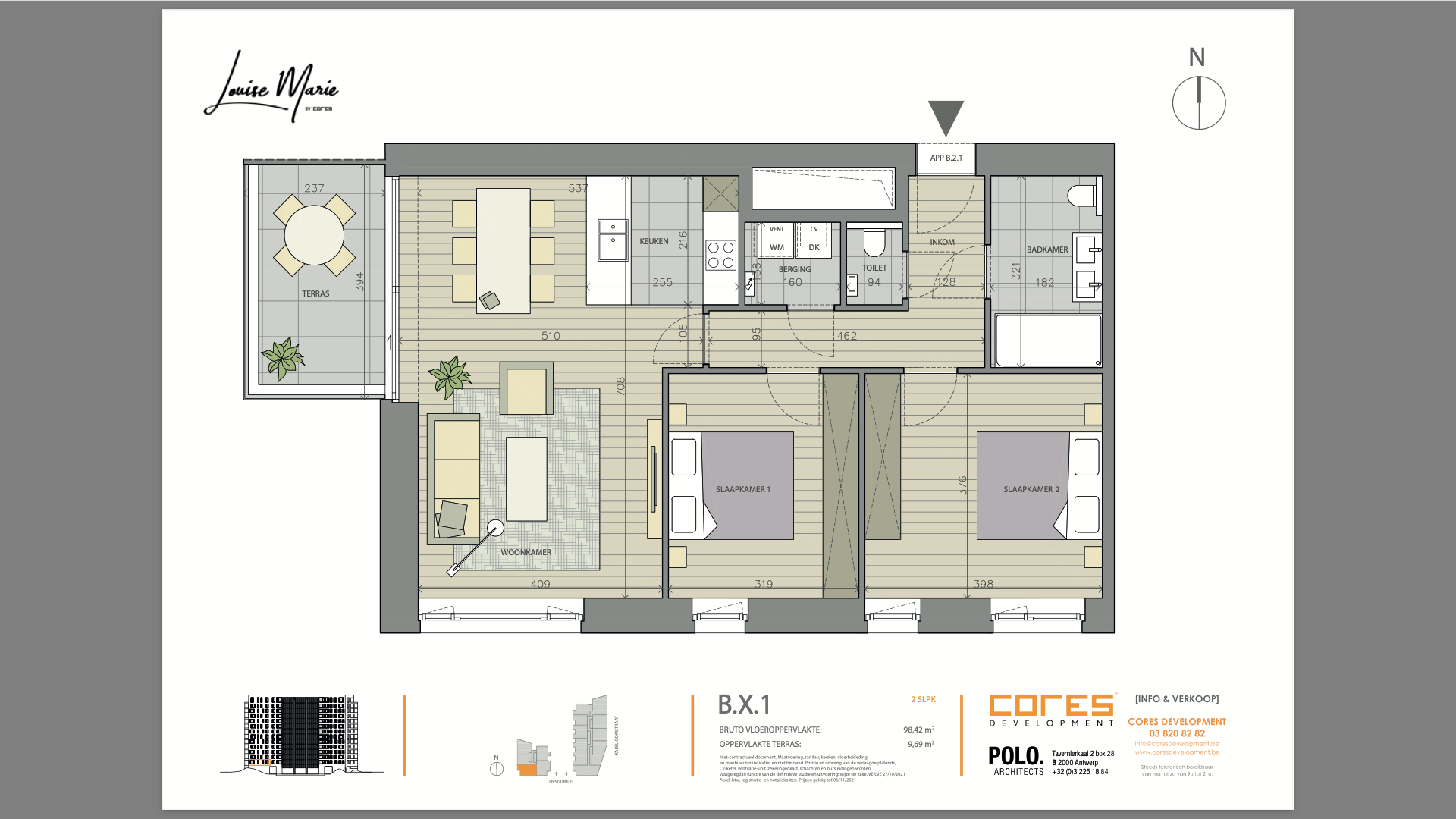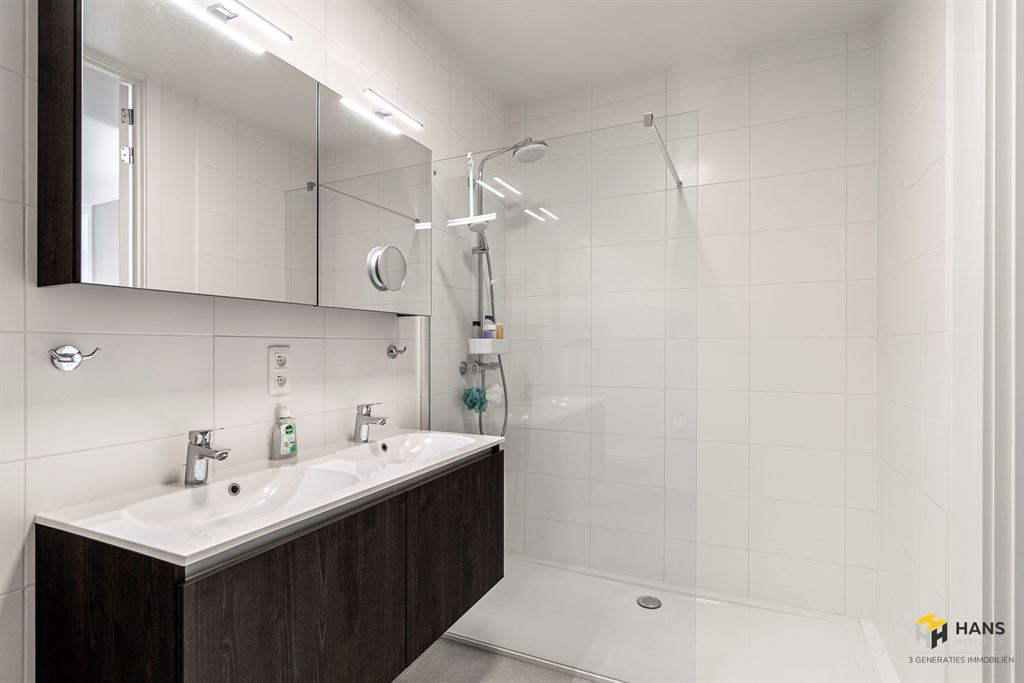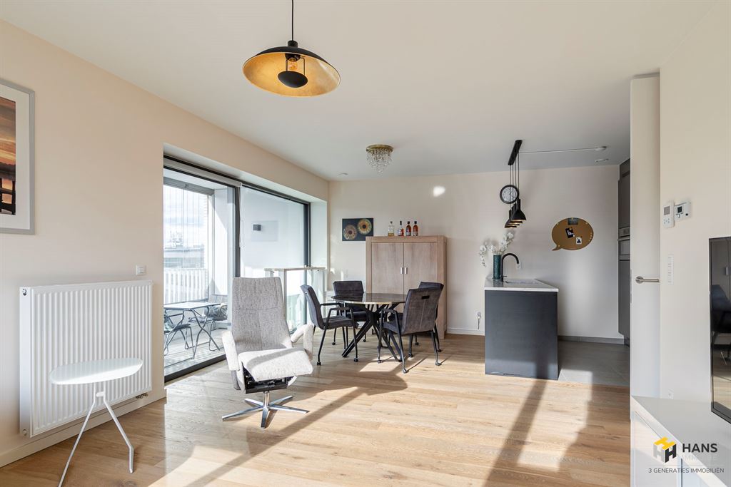 Via de 3-punts-veiligheidsdeur betreed je het appartement in de hal. Aan de rechterzijde is er een apart gastentoilet, aan de linkerzijde de badkamer (6 m²) met lavabomeubel, handdoekdroger, toilet en inloopdouche. Verder in de hal bereik je de 2 volwaardige slaapkamers van 12 m² en 15 m² met hiertegenover een praktische berging/wasplaats (2 m²). Aan het uiteinde Vande L-vormige hal treffen we de woonkamer met open, volledig uitgeruste keuken (32 m²). Door de strakke uitstraling van de opvallende kamerhoge deuren lijken alle ruimtes groter en luxueuzer. Het terras (10 m²) is zuid-west-georiënteerd en de balkonbeglazing kan volledig worden open geschoven, waardoor je in een handomdraai een open of juist beschut terras creëert — een echte meerwaarde voor elk seizoen.