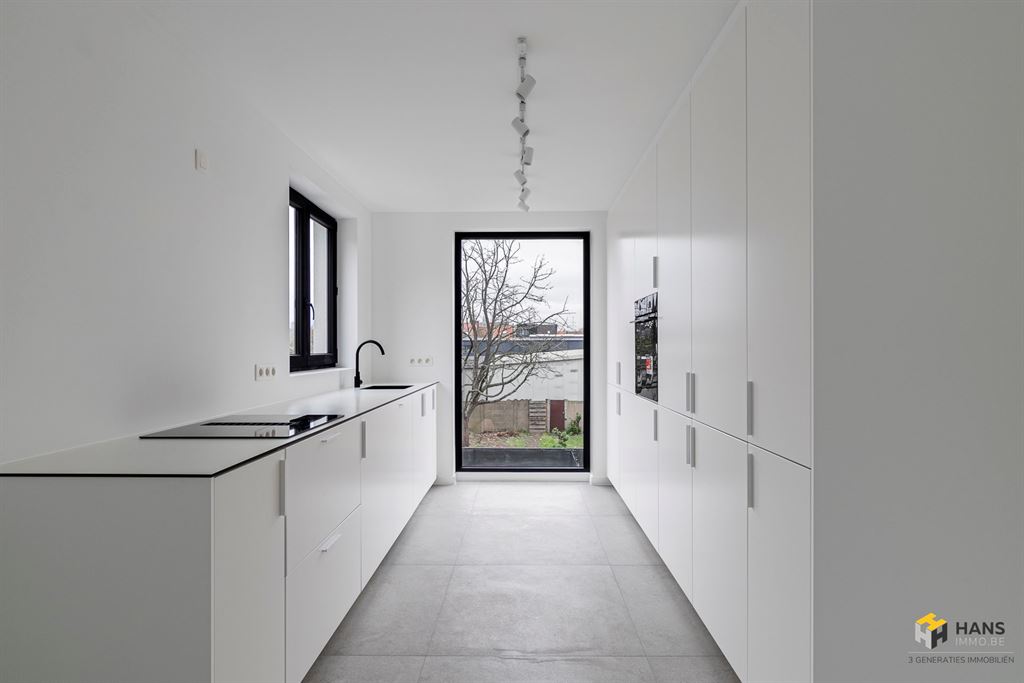 Bij het binnenkomen vind je meteen rechts een apart gastentoilet. Vervolgens loop je recht op de moderne leefkeuken, die met haar royale oppervlakte van 26 m² niet alleen alle hedendaags comfort biedt — kookvuur met afzuigsysteem, ingebouwde oven, vaatwasser, frigo en vriezer — maar ook een uitgestrekt, open zicht over de omgeving. Aansluitend bevindt zich het gezellige terras (9 m²) met noord-oost-oriëntatie. Aan de voorzijde ligt de ruime woonkamer (33 m²), perfect in te richten volgens jouw woonstijl. Via de aparte traphal bereiken we de bovenverdieping, waar twee volwaardige slaapkamers van telkens 15 m² te vinden zijn. De badkamer (3 m²) is uitgerust met een inloopdouche en stijlvol lavabomeubel. Tot slot is er nog een aparte wc aanwezig met ruimte om een wasmachine te plaatsen.