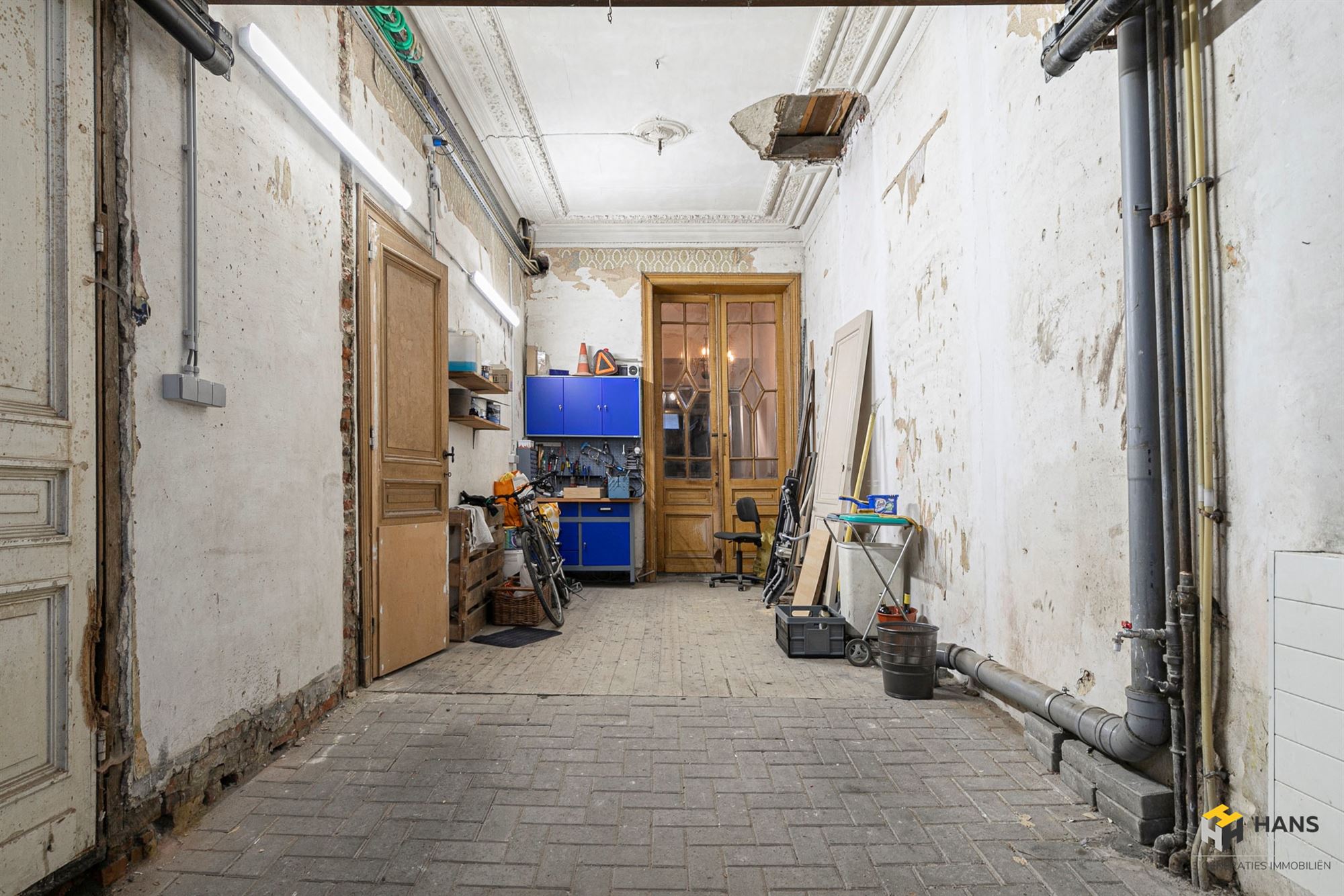 Op het gelijkvloers vinden we een inpandige garage met aansluitend een multifunctionele ruimte van 54 m². Deze ruimte leent zich perfect als hobby- of fitnesskamer, atelier of werkruimte — de invulling bepaal je volledig zelf. Achteraan bevindt zich bovendien al een eerste badkamer, wat de mogelijkheden nog verder vergroot.