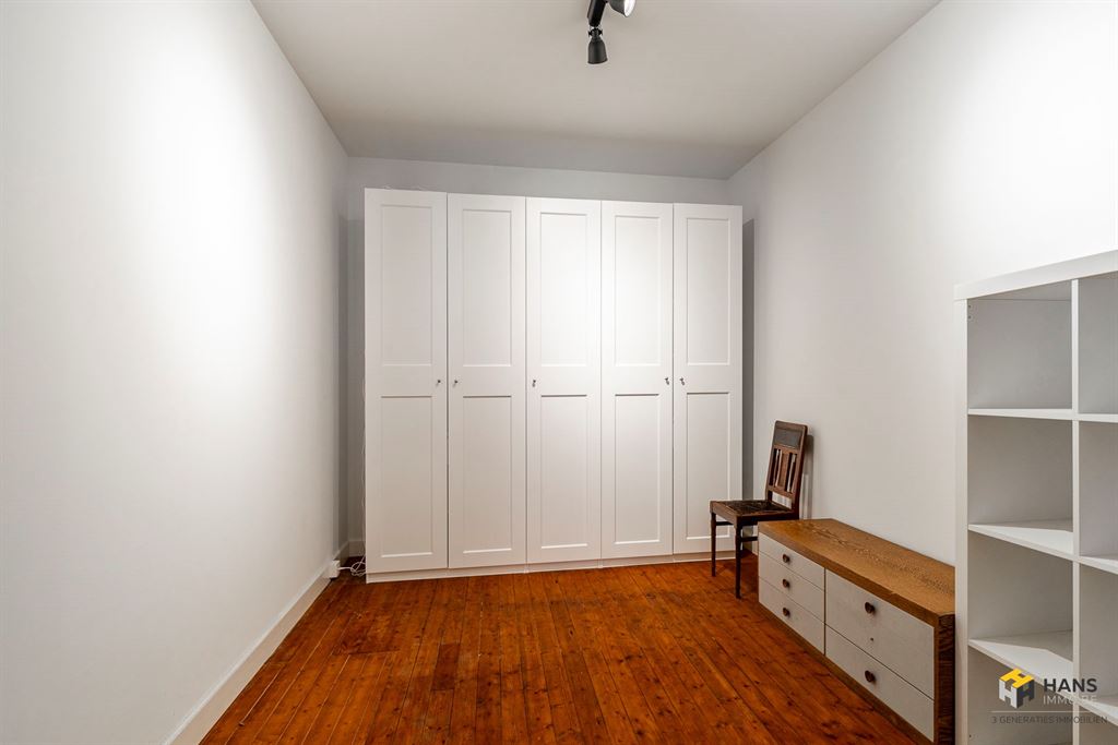 Via de authentieke traphal bereiken we de eerste verdieping, waar zich een apart gastentoilet bevindt in de hal. Achter een glazen deur kom je terecht in de ruime leefruimte met uitgeruste keukenhoek, samen goed voor een oppervlakte van zo’n 60 m². Achteraan is er een eerste platdak met zuidwest-oriëntatie te vinden, ideaal om in alle rust van de zon te genieten.