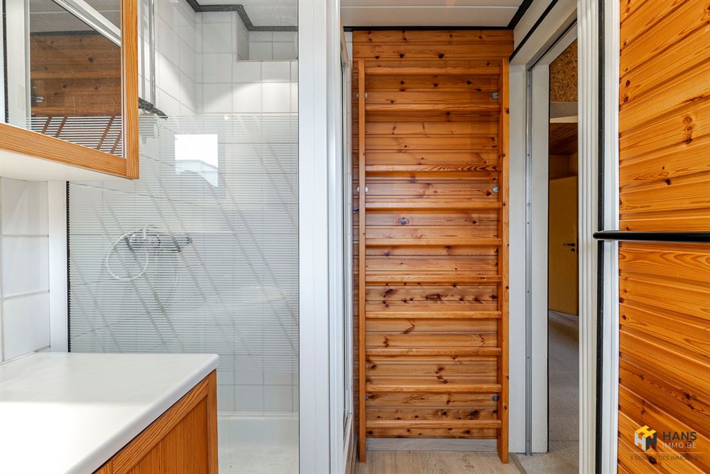Op de eerste verdieping treffen we vooraan de woonkamer (32 m²) met aansluitend de aparte keuken (9 m²). Verder is er op deze verdieping een eerste badkamer met douche, lavabo en toilet te vinden.