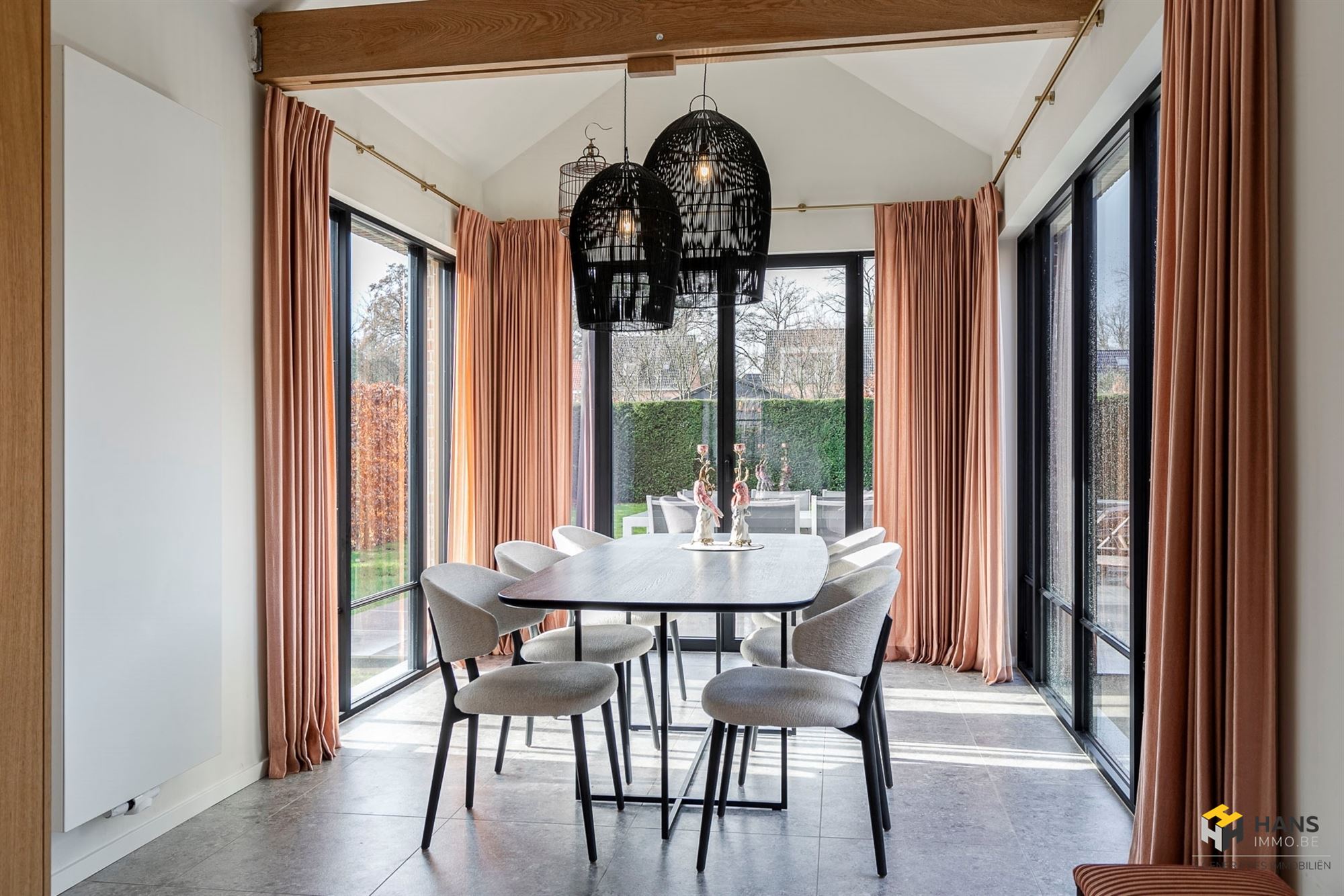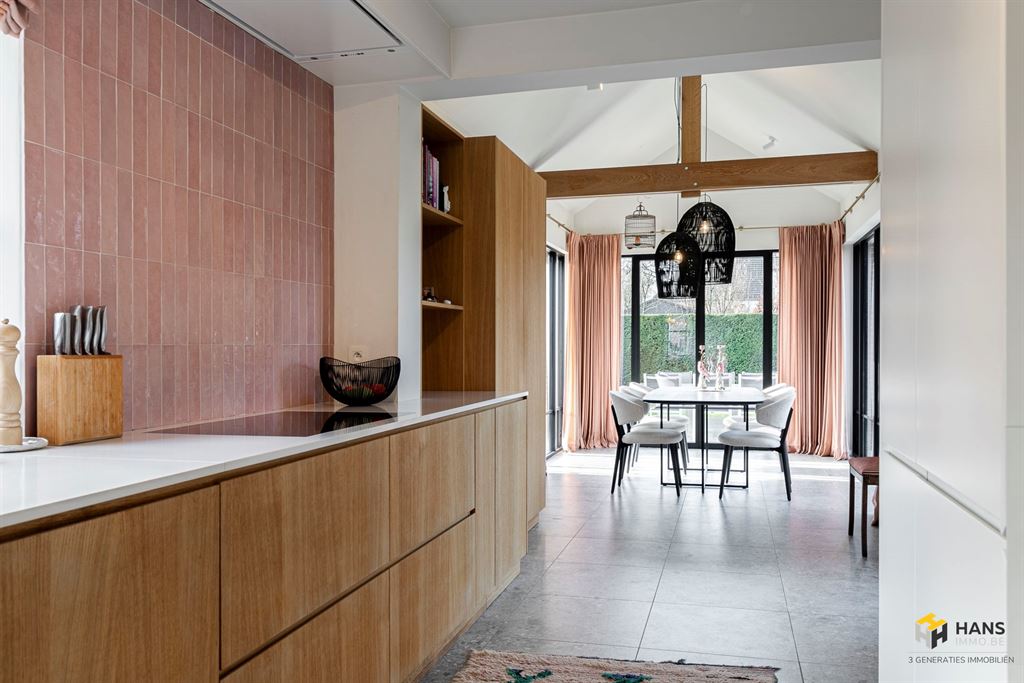 De aparte leefkeuken (31 m²) vormt een echte eyecatcher en is uitgerust met alle hedendaags comfort. Vanuit de eethoek heb je een mooi zicht op de tuin en dankzij de zonnescreens geniet je hier ook op warme dagen van een aangenaam binnenklimaat.