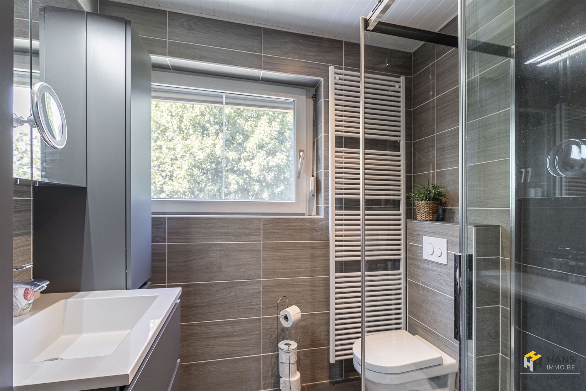 Op de bovenverdieping bevinden zich de 3 slaapkamers, waarvan 2 van gelijke grootte (15 m²) zijn en de derde 7 m² groot is. De badkamer (5 m²) is voorzien van een lavabomeubel, handdoekdroger, wc en douche.