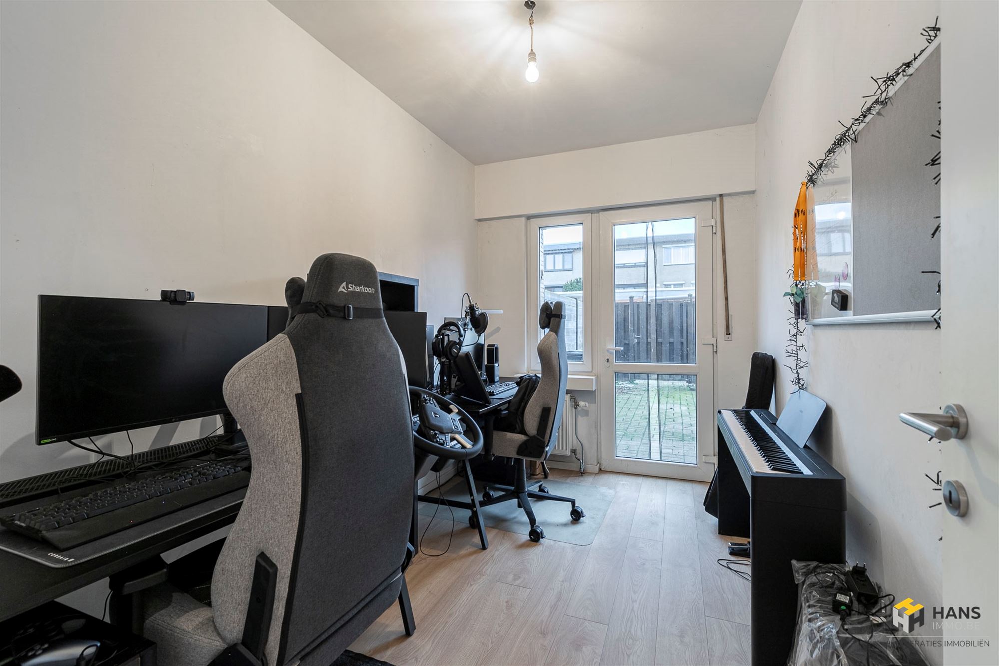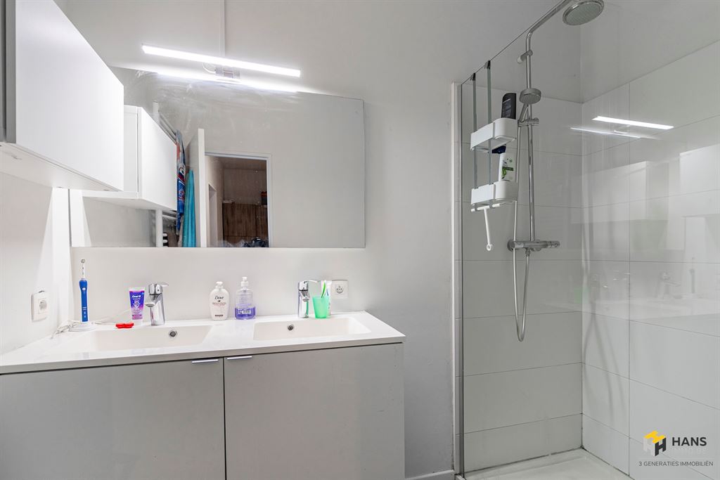 De L-vormige hal leidt verder naar de twee slaapkamers (9 m² en 15 m²), rustig gelegen aan de achterzijde. Vanuit de kleinste slaapkamer heb je toegang tot de noord-georiënteerde buitenruimte (50 m²). Via de achteruitgang bereik je bovendien vlot de garagebox achter de woonst — een bijzonder praktische troef. Centraal in het appartement bevinden zich nog een berging/wasplaats (3 m²), een apart toilet en de badkamer (5 m²), uitgerust met een lavabomeubel, handdoekradiator en inloopdouche.