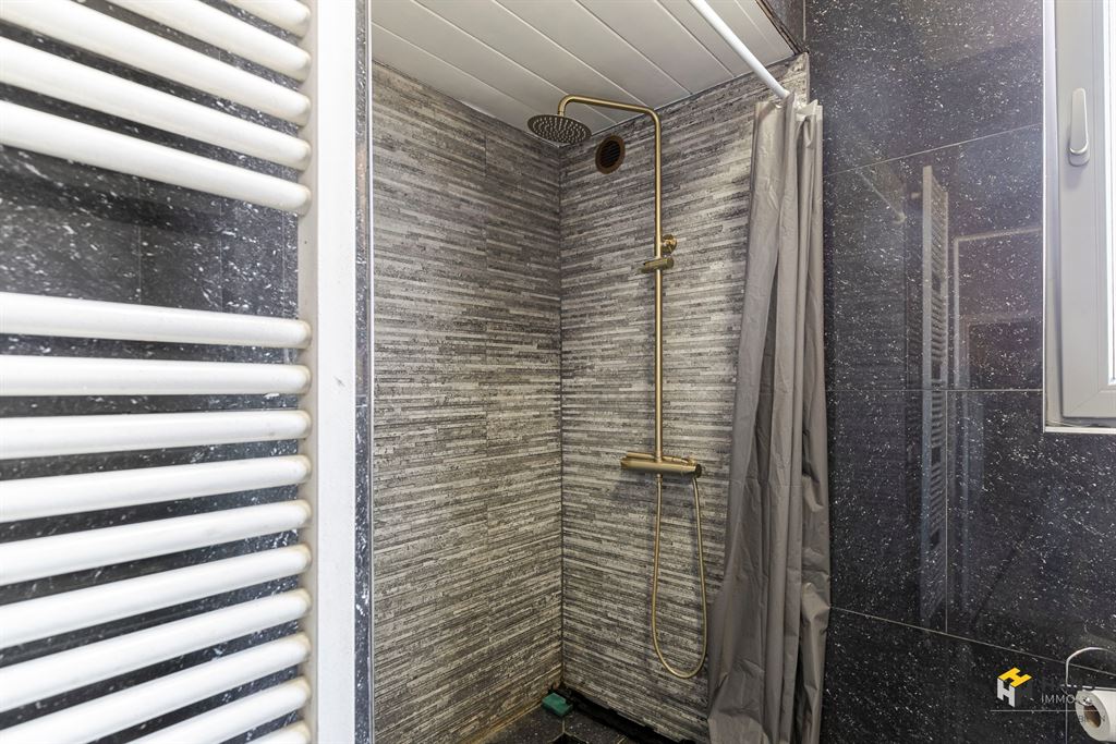 Op de eerste verdieping situeren zich de leefruimtes. Vooraan bevindt zich de L-vormige woonkamer (35 m²), terwijl je achteraan de aparte keuken (11 m²) terugvindt, uitgerust met alle hedendaags comfort. Aansluitend ligt de moderne badkamer (5 m²), ingericht met een inloopdouche, handdoekdroger, toilet en lavabomeubel.