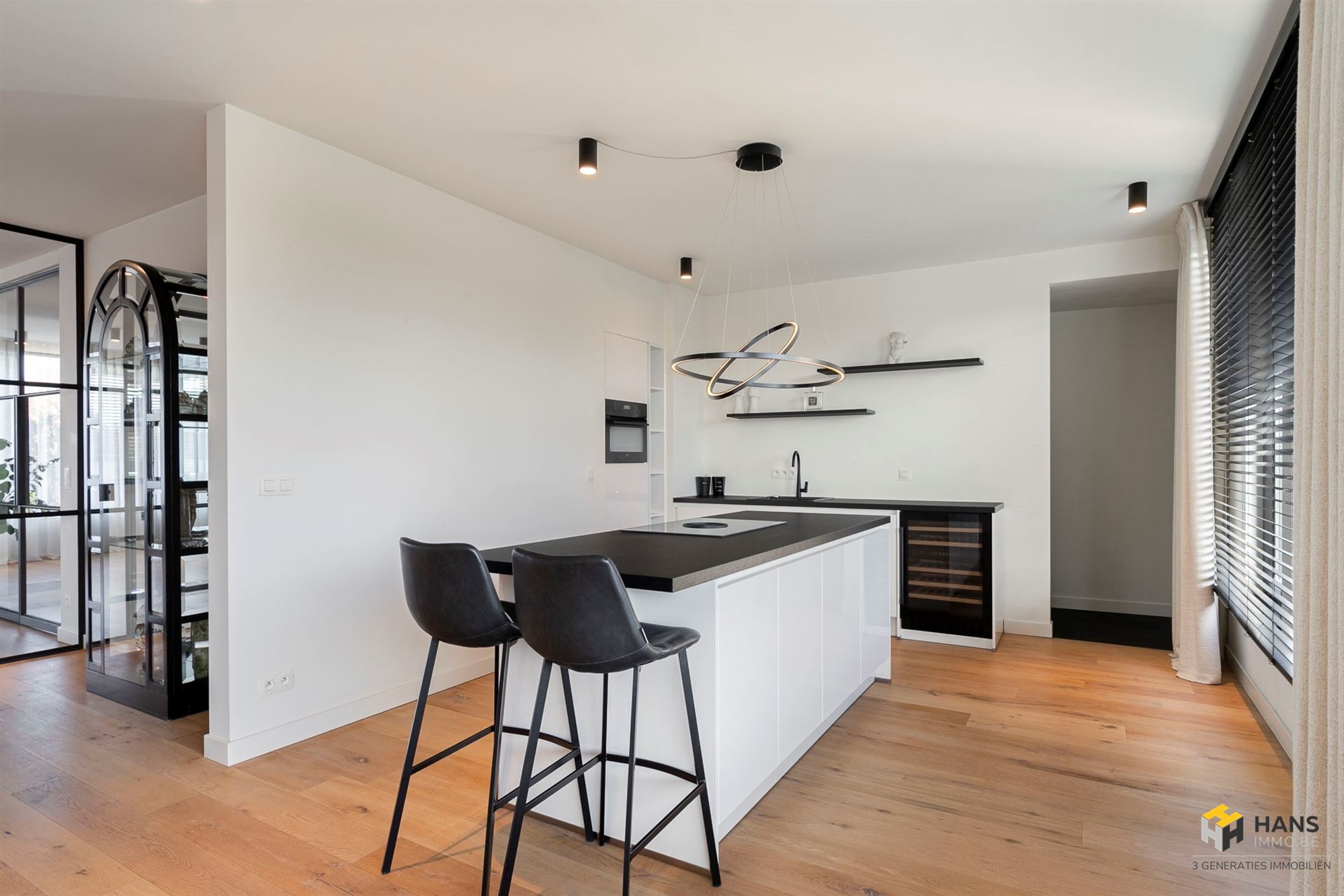 Je komt binnen in de inkom-/traphal met apart gastentoilet, handige bergruimte onder de trap en directe toegang tot het zuid-west-gerichte terras (10 m²). Daarna stap je de royale leefruimte binnen — een indrukwekkende 73 m² — waar licht en ruimte centraal staan. De open leefkeuken bevindt zich achteraan en is volledig uitgerust met alle hedendaags comfort, inclusief een stijlvolle wijnkast als extra troef. Aansluitend vind je de praktische berging/wasplaats van 7 m².