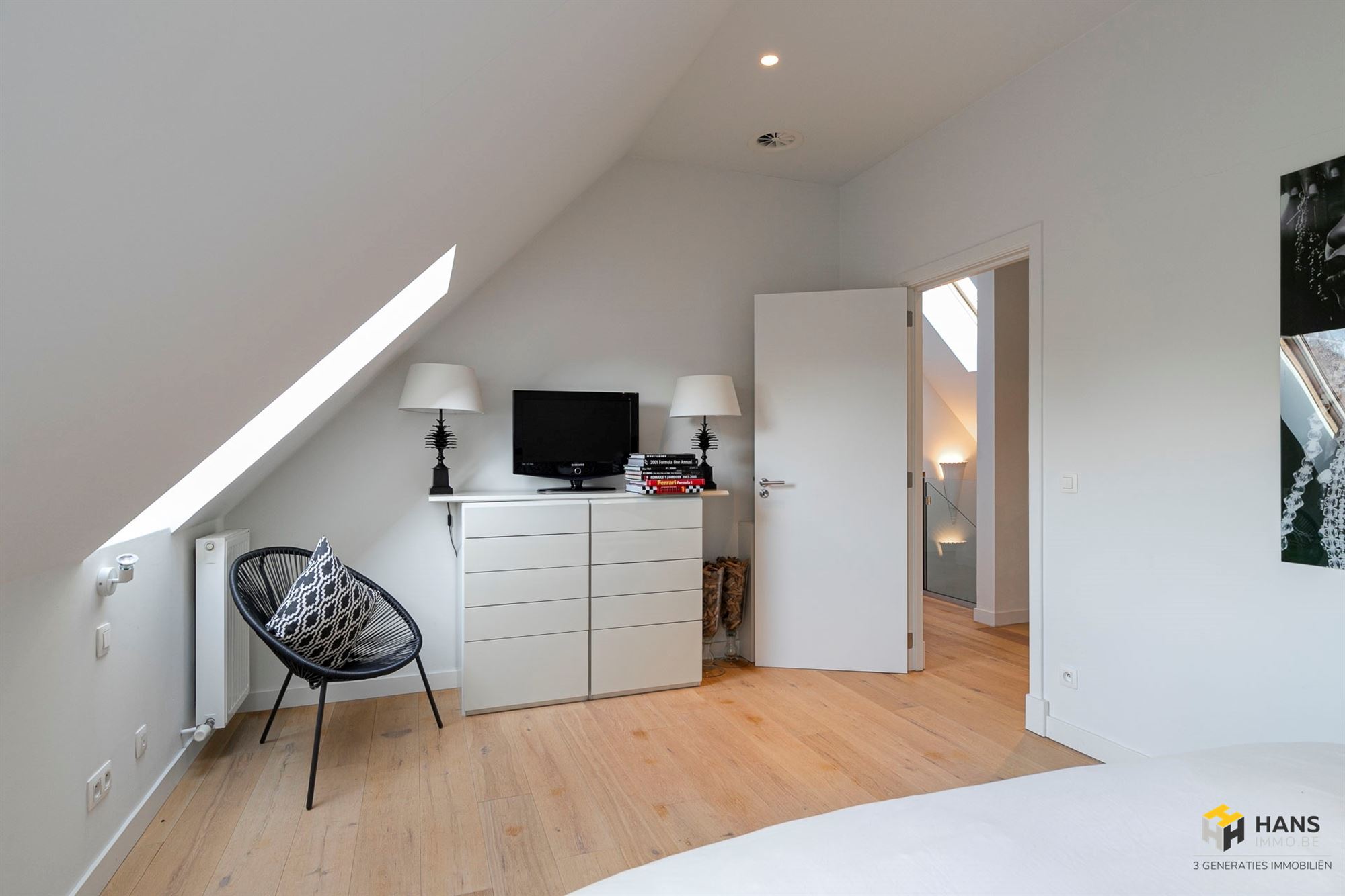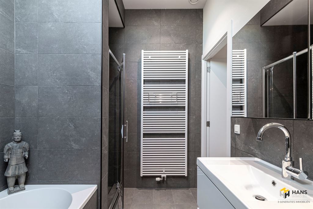 Boven beschik je over 2 volwaardige slaapkamers van telkens 17 m², een bureauhoek, een apart toilet en een ruime badkamer (10 m²) met ligbad, dubbele lavabo, handdoekradiator en douche.