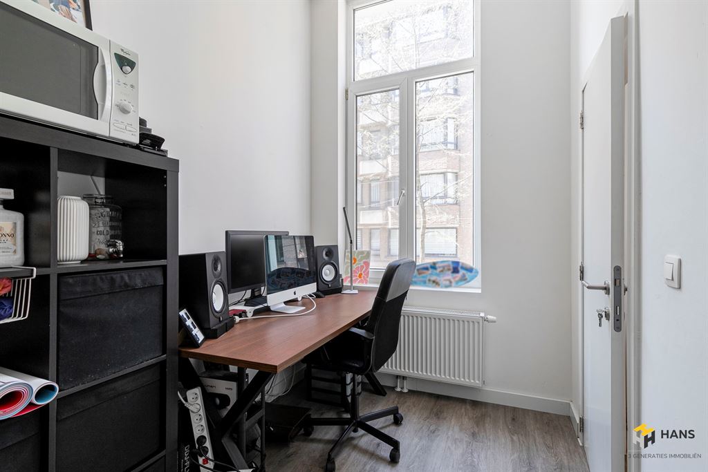 Aan de voorzijde bevindt zich de lichtrijke leefruimte met open, volledig uitgeruste keuken, samen goed voor een royale oppervlakte van circa 39 m². Ook vooraan vind je een eerste (slaap)kamer van 8 m², momenteel ingericht als bureau. Achteraan bevindt zich de ruime, volwaardige slaapkamer van 17 m².