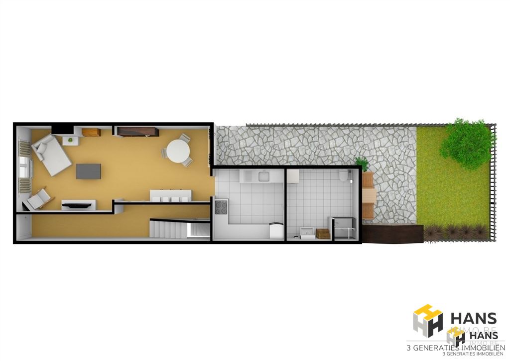 We betreden de woning in een uitgestrekte inkom-/traphal (11 m²) met onder de trap een deur naar de kelder. Reeds bij het binnenkomen vallen het unieke karakter en de charme van de woonst op. Links hebben we toegang tot een open leefruimte (28 m²) met een aangename hoeveelheid daglicht. Aansluitend situeert zich achteraan de keuken (9 m²), dewelke voorzien is van een kookvuur, dampkap, spoelbak en ingebouwde oven. Vervolgens bereiken we de badkamer (9 m²) met douchecabine, lavabomeubel, wc en ruimte om een wasmachine te plaatsen. Tot de zonovergoten tuin (50 m²) hebben we toegang middels een afstapje vanuit de keuken.