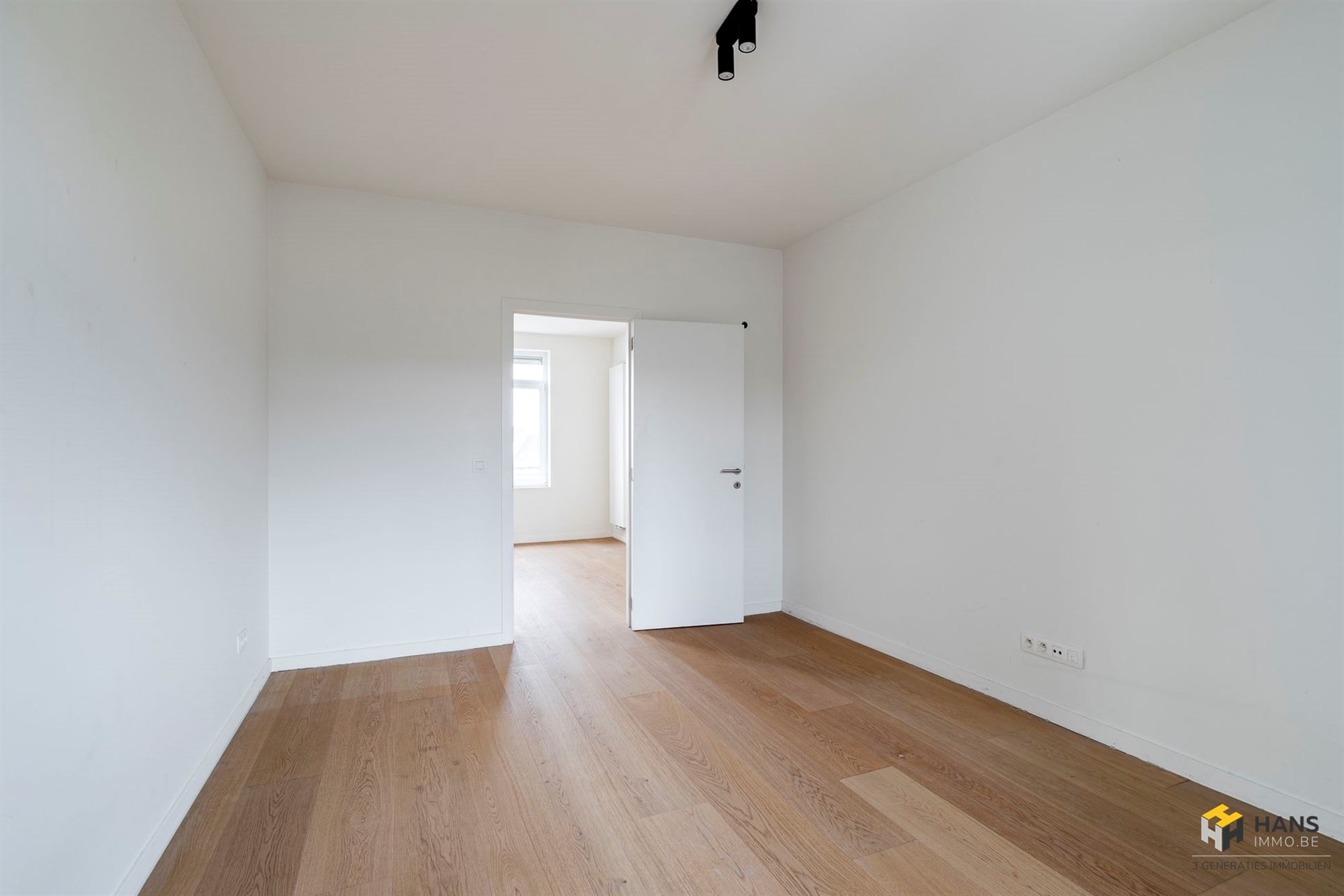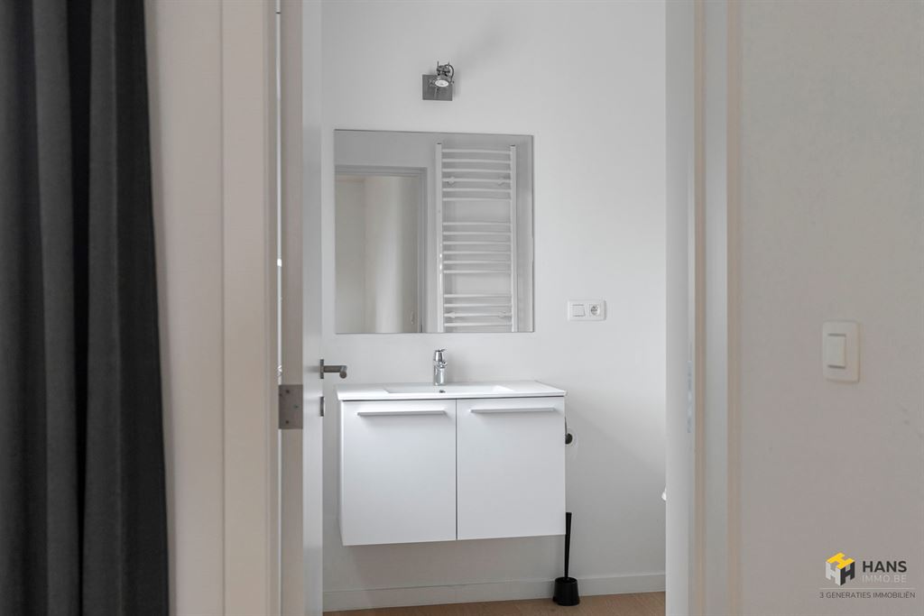 Je betreedt het appartement rechtstreeks in de lichtrijke leefruimte met open keuken (21 m²). De keuken is volledig uitgerust met kookvuur, dampkap, ingebouwde oven, vaatwasser, koelkast, vriezer en wasmachine met ingebouwde droogkast. Alles wat je nodig hebt voor comfortabel dagelijks gebruik. De parketvloer zorgt voor een warme uitstraling en loopt naadloos door in de aangrenzende slaapkamer (15 m²). Achteraan bevindt zich de badkamer (4 m²), ingericht met een douchecabine, lavabomeubel, toilet en handdoekdroger.