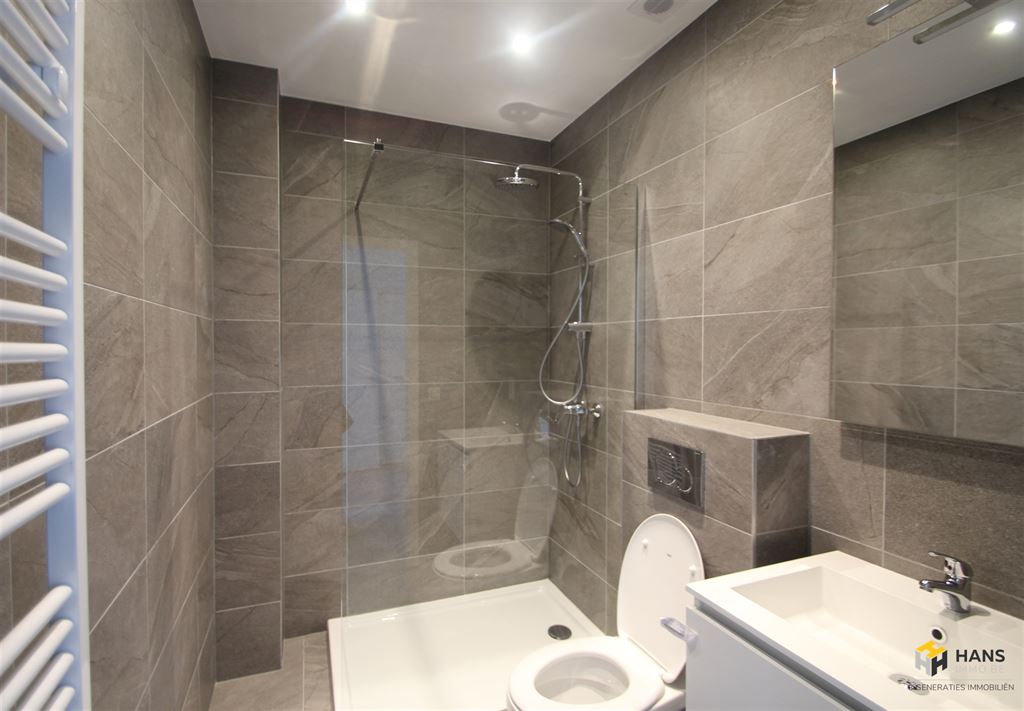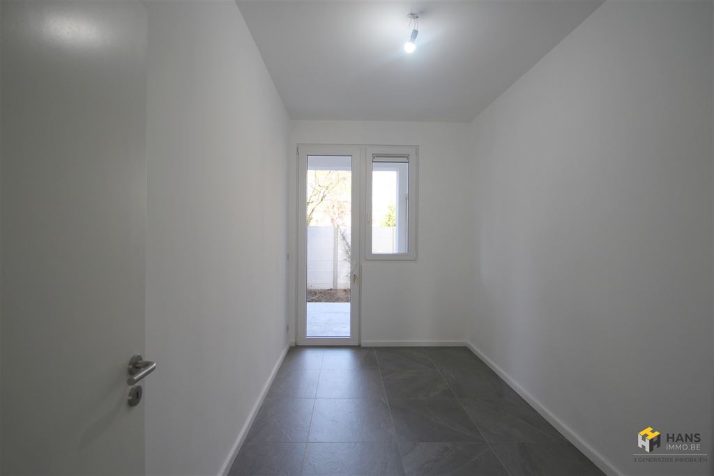 We betreden het appartement in een centrale hal (8 m²) waar we toegang hebben tot een opbergruimte voorzien van aansluiting voor de wasmachine en droogkast. Daartegenover de badkamer (4 m²). Deze is afgewerkt met een lavabomeubel, handdoekenradiator, ruime inloopdouche en toilet. Aan de achterzijde van de woning bevinden zich de 2 slaapkamers. Grote slaapkamer van 12 m². Kleine slaapkamer van 8m², deze ruimte biedt toegang tot het prachtig overdekte terras van 11m² en tuin van 48m². Vooraan situeert zich de leefruimte met open keuken in een mooie oppervlakte van 25 m². De keuken is voorzien van alle comfort: kookvuur, dampkap, spoelbak, in gebouwde oven en frigo met vriesvak.